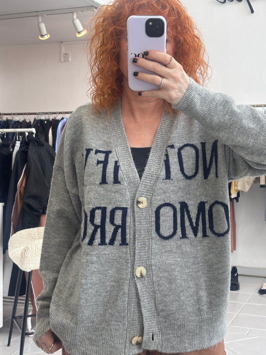 Sold outGrey cardigan with blue letters