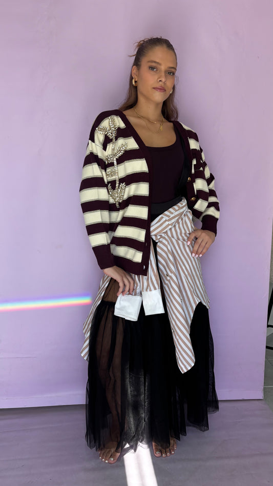 Striped long Cardigan with rhinestones