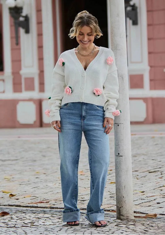 Offwhite knit cardigan with flowers