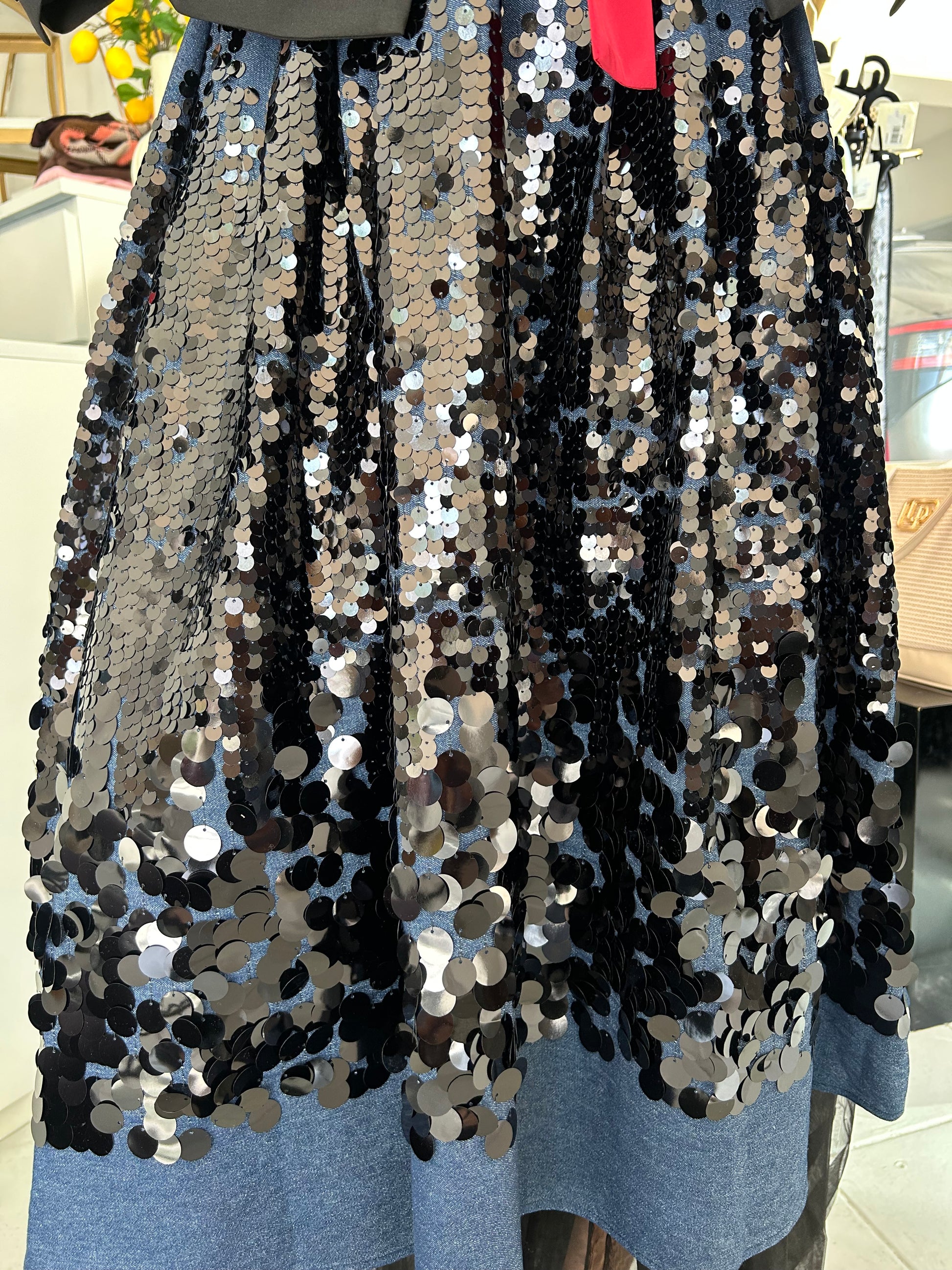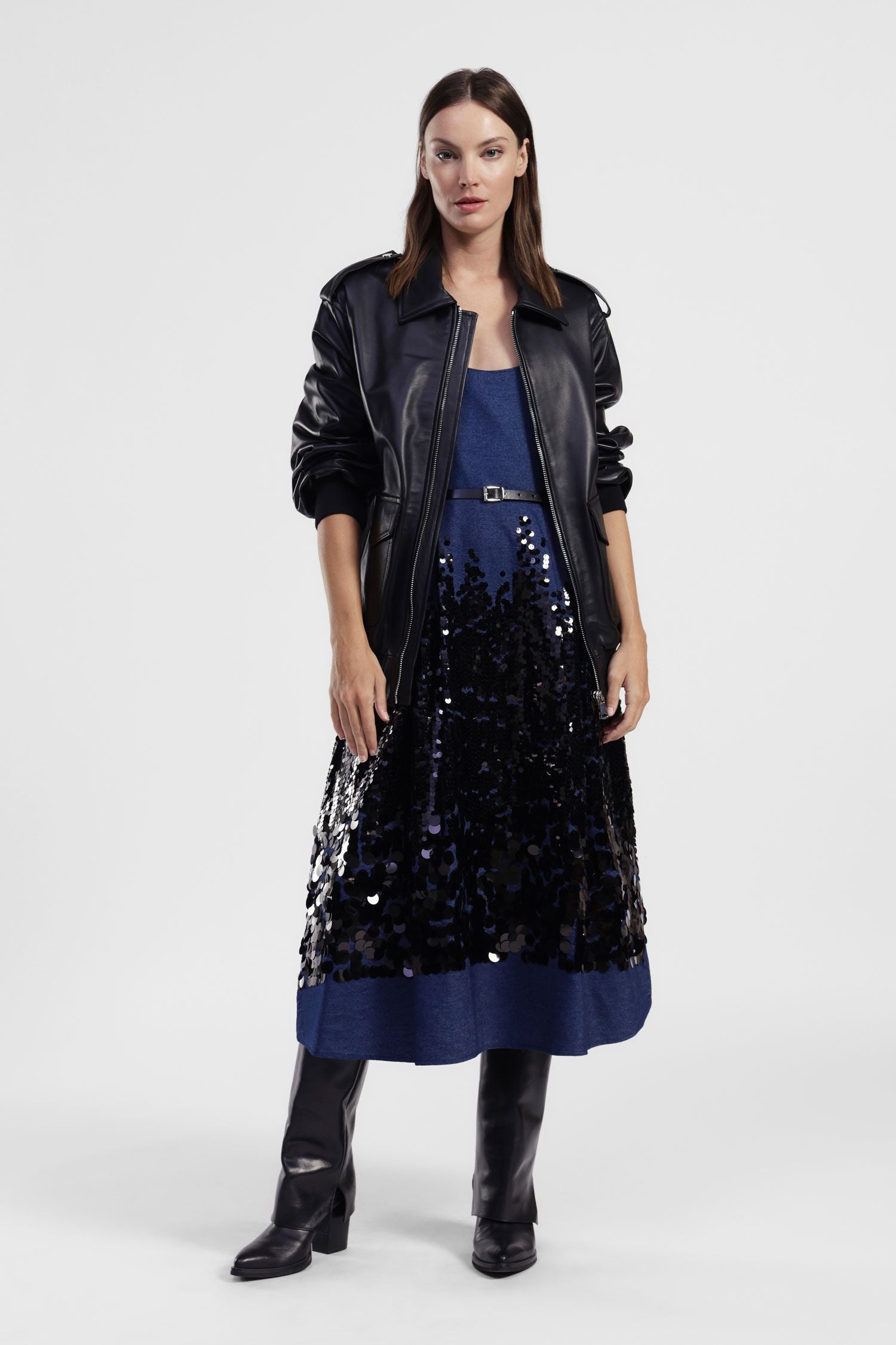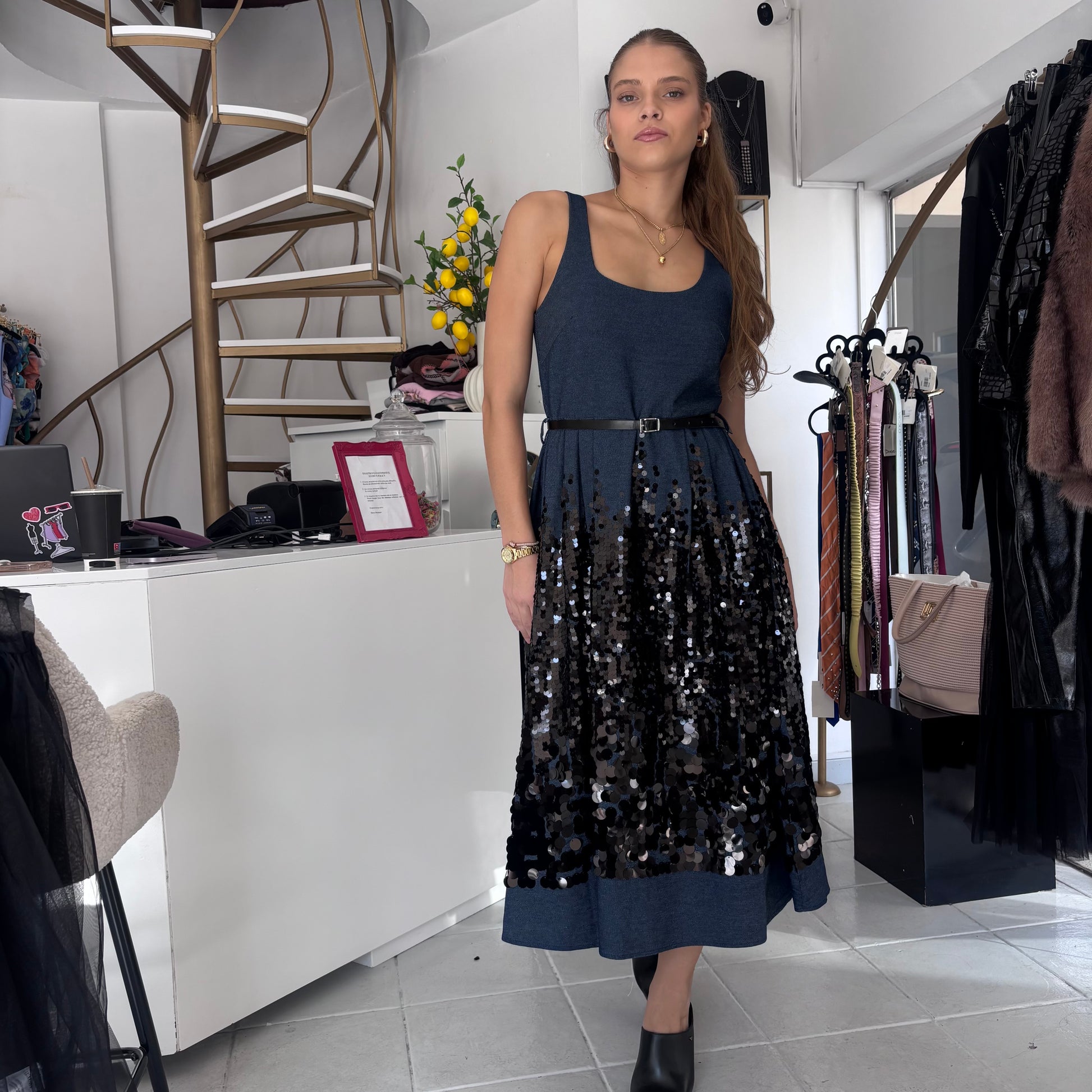 Dixie midi dress with thin straps and a round neckline, embellished with a thin belt at the waist and shiny sequins at the hem. The flared silhouette ensures movement and comfort, perfect for standing out both day and night.