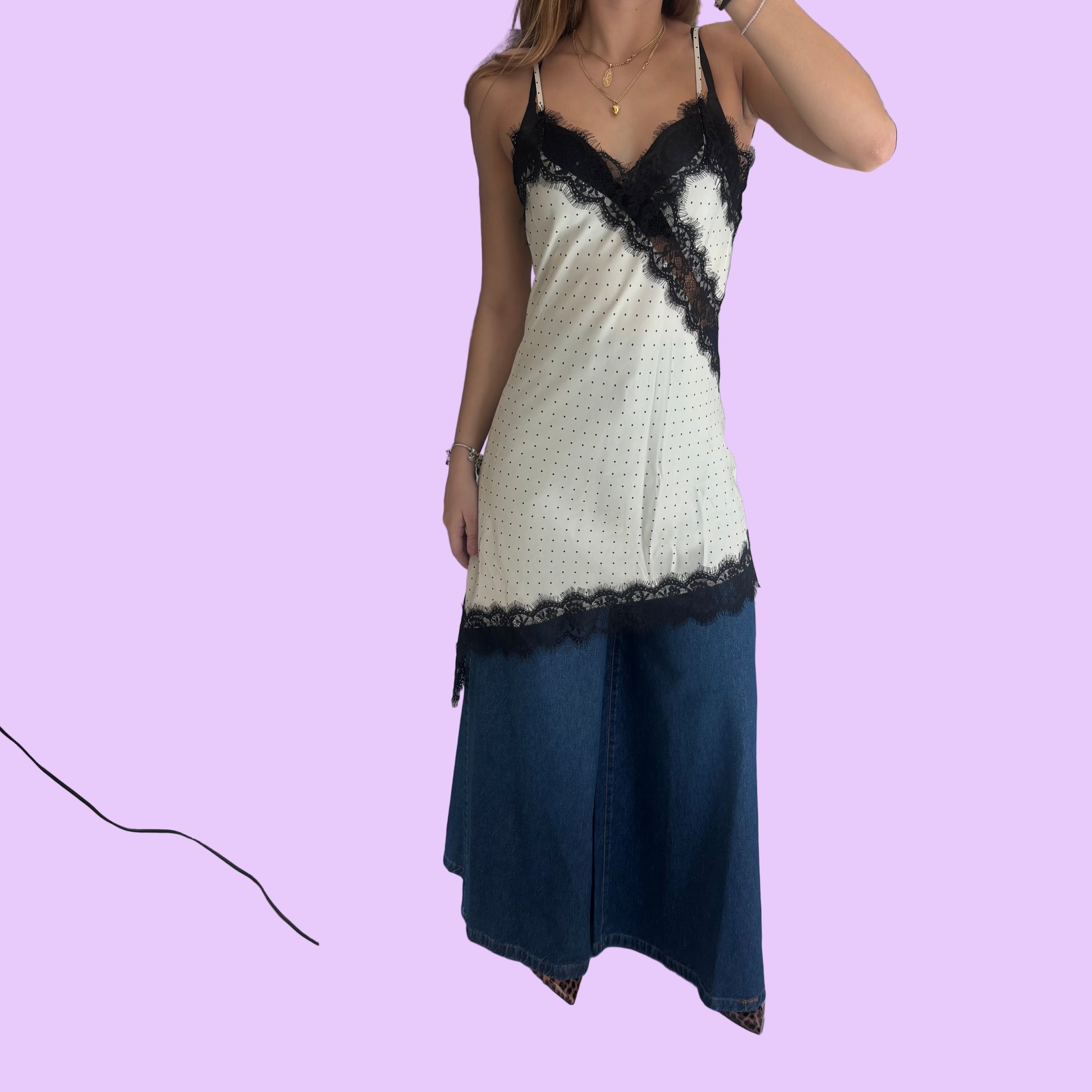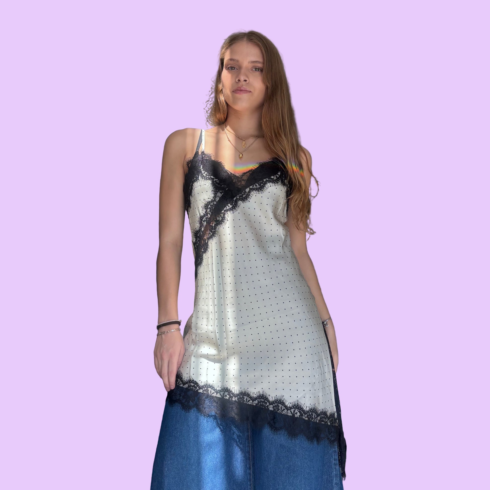Vicolo cream petit pois asymmetric dress with lace details, spaghetti straps and a slit on the side