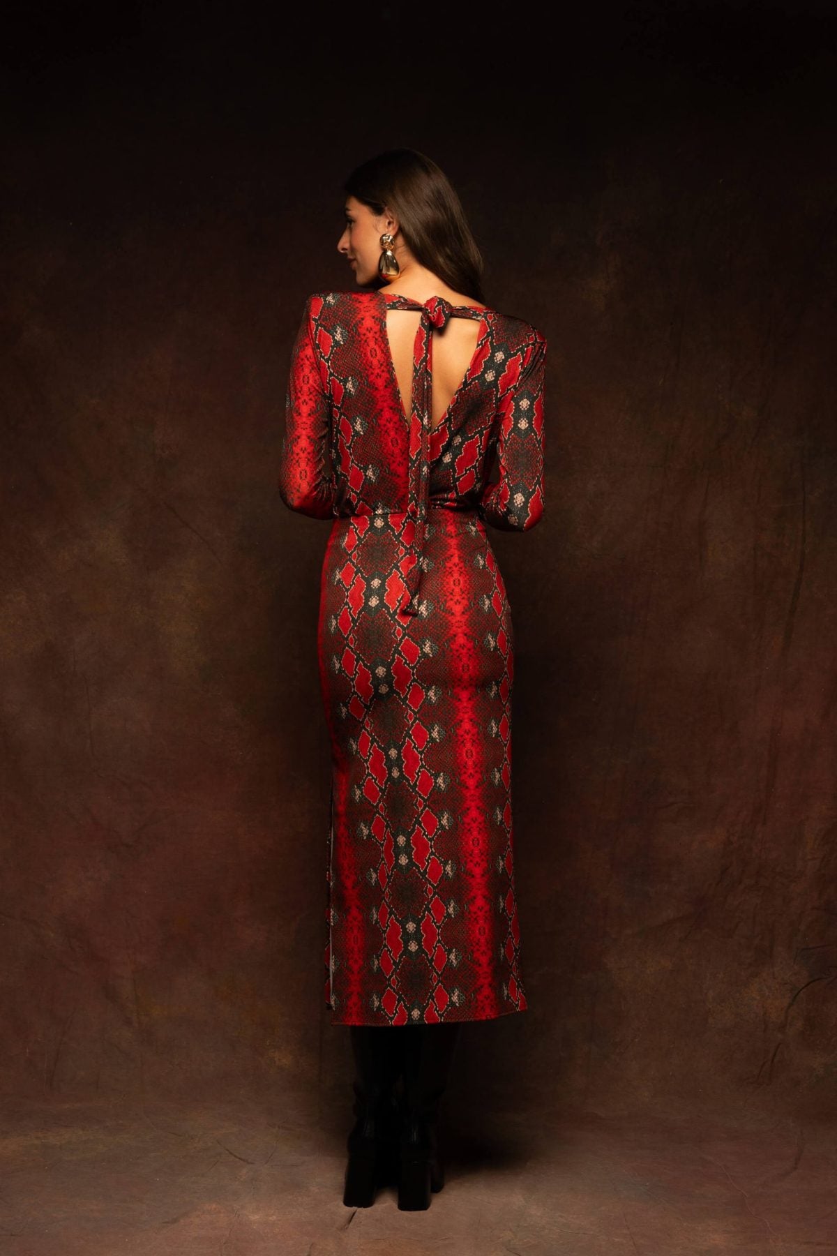 Mairis Long-sleeve wrap bodysuit with shoulder pads and double-layered fabric to prevent sheerness. The straps at the back can be tied in multiple ways, either as a choker around the neck or simply at the back. Features a snap closure at the bottom.