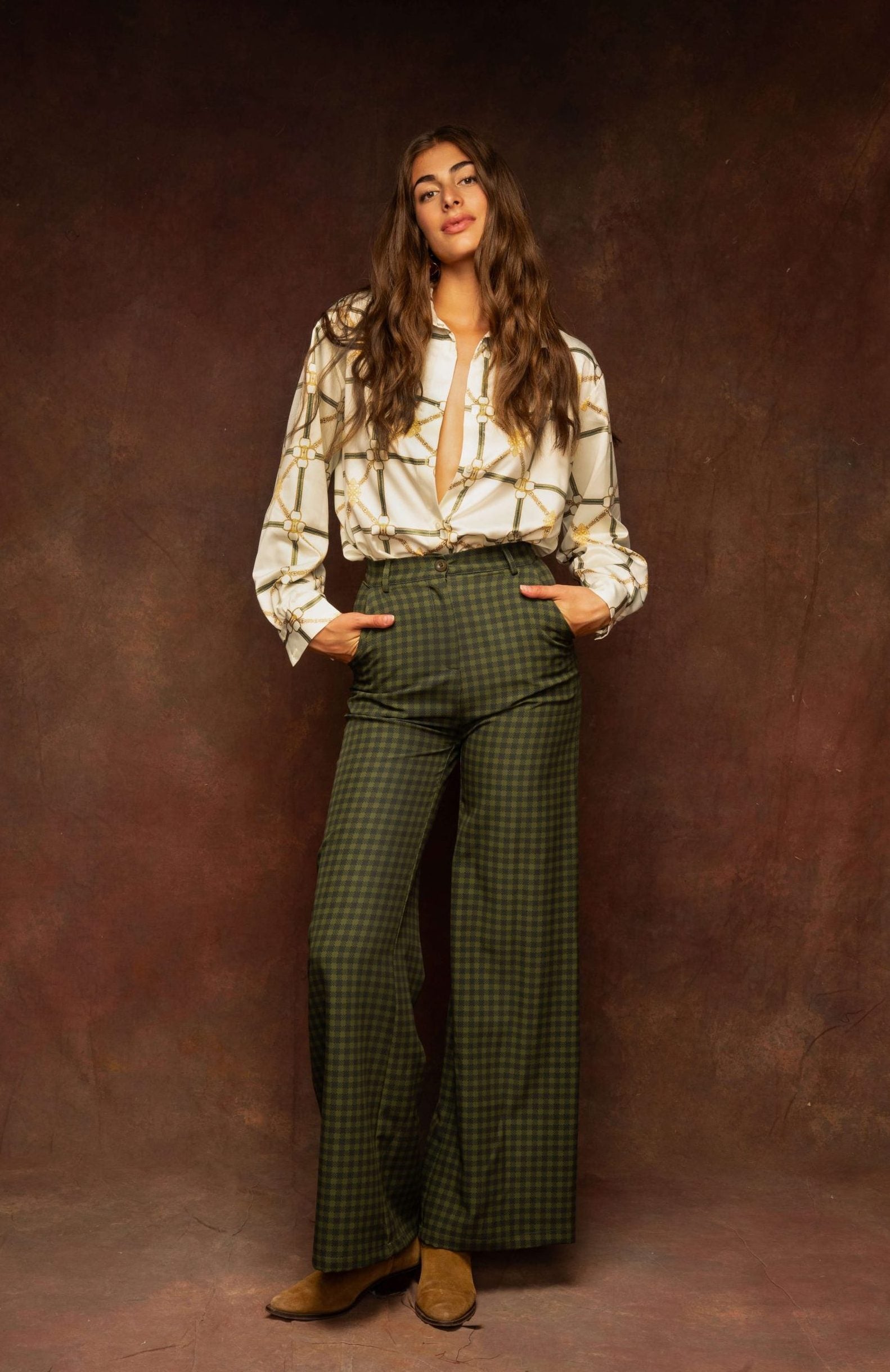 Mairis Pants with a waistband and pockets. The fabric has a bit of stretch to fit the hips, while the legs flare out into a bell-shape at the bottom.