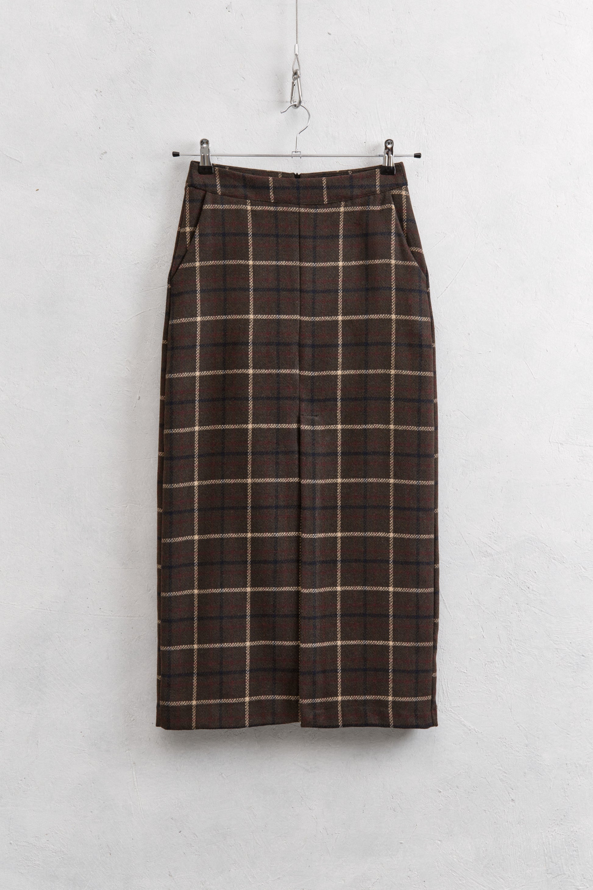 Online Wool blend pencil skirt. Made in a checked pattern. Features a front slit. Side pockets and a back zipper.