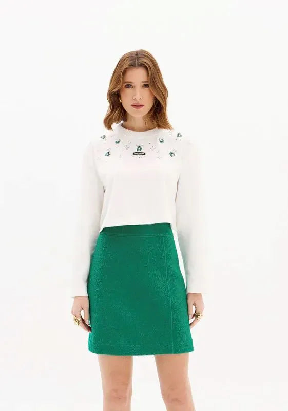 This long-sleeved sweatshirt with embellishments is the ideal piece to combine comfort, sophistication, and a touch of fashion in your everyday life. Made from a substantial and soft fabric, it provides warmth and an impeccable fit. Its cropped design is modern and enhances combinations with high-waisted pieces. The highlight is the delicate embellishments on the front and shoulders, with rhinestones and embroidery that create a discreet floral effect, bringing shine and elegance to the look.